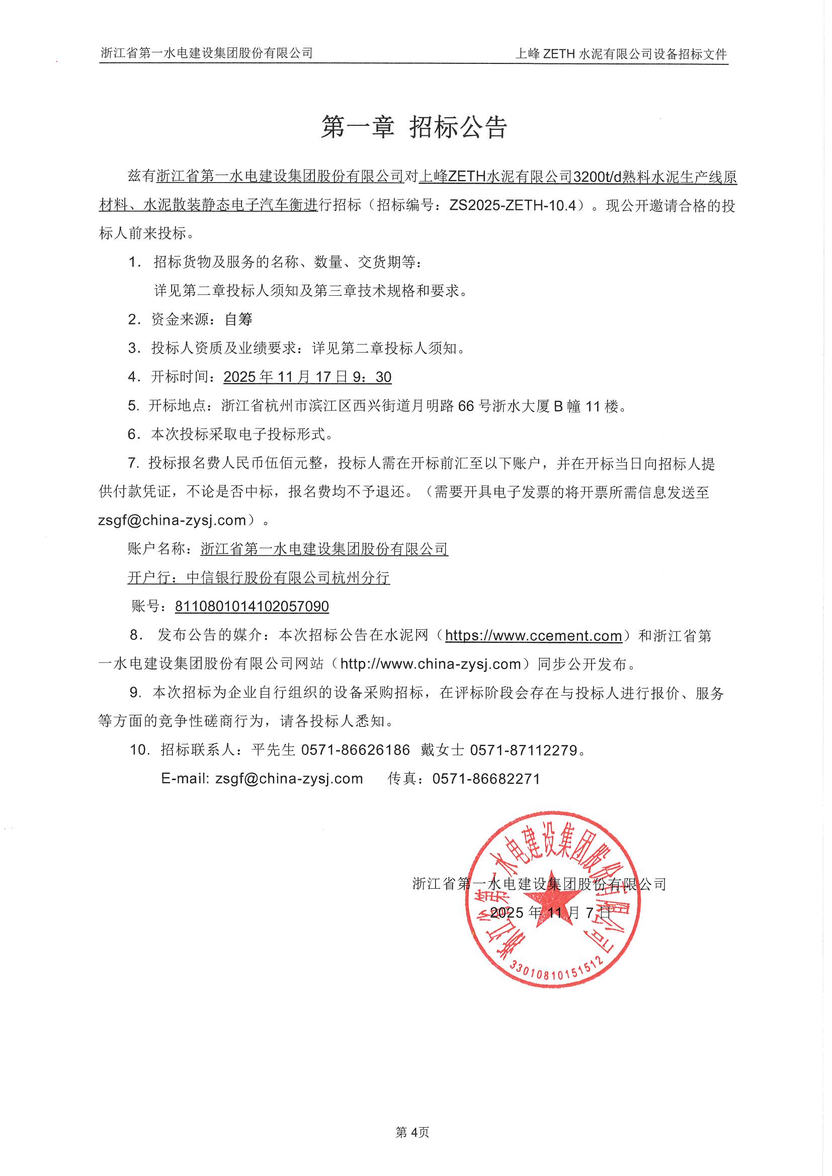 上峰ZETH水泥有限公司3200t/d熟料水泥生產(chǎn)線原材料、水泥散裝靜態(tài)電子汽車衡招標(biāo)公告