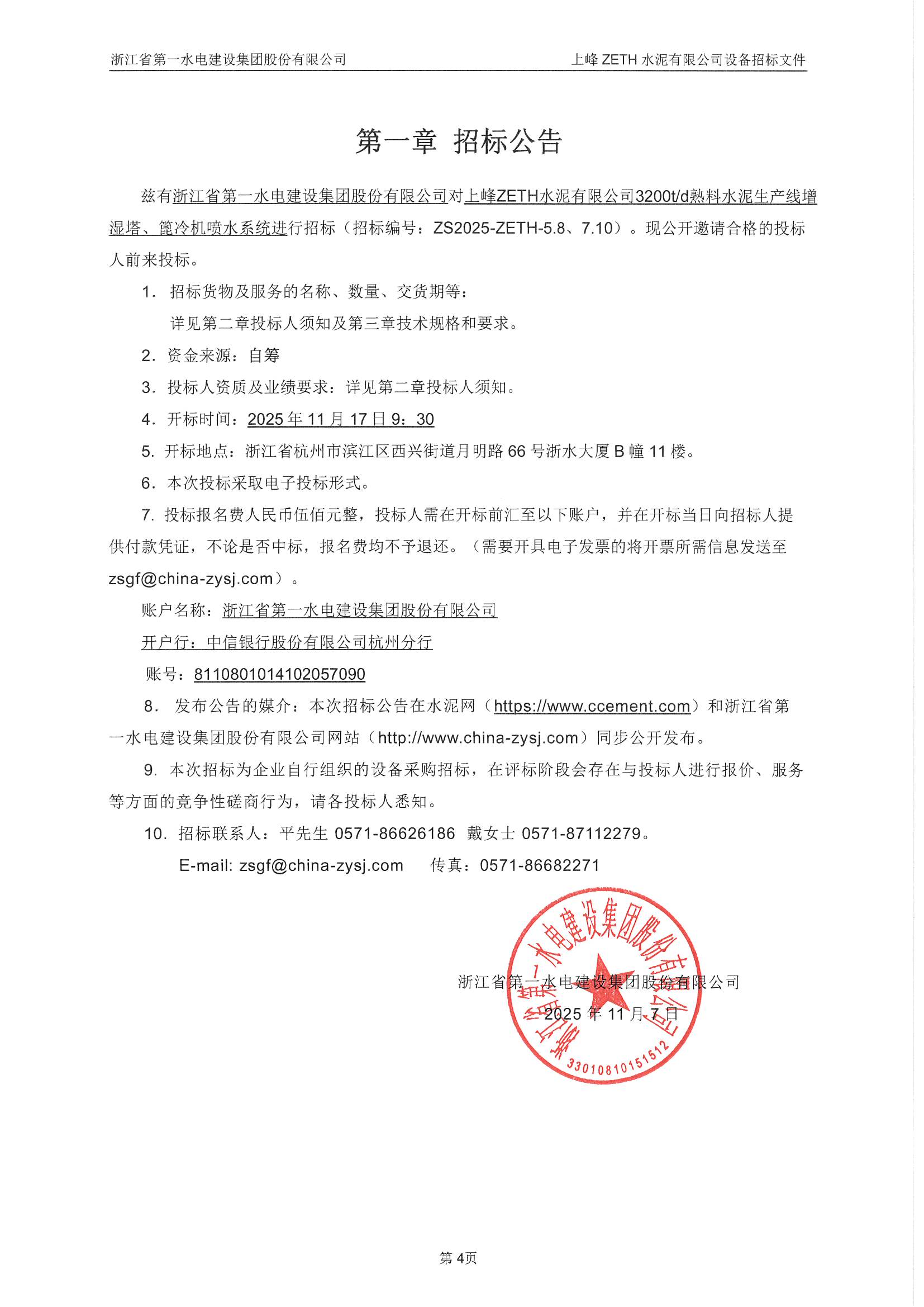 上峰ZETH水泥有限公司3200t/d熟料水泥生產(chǎn)線增濕塔、篦冷機噴水系統(tǒng)招標(biāo)公告