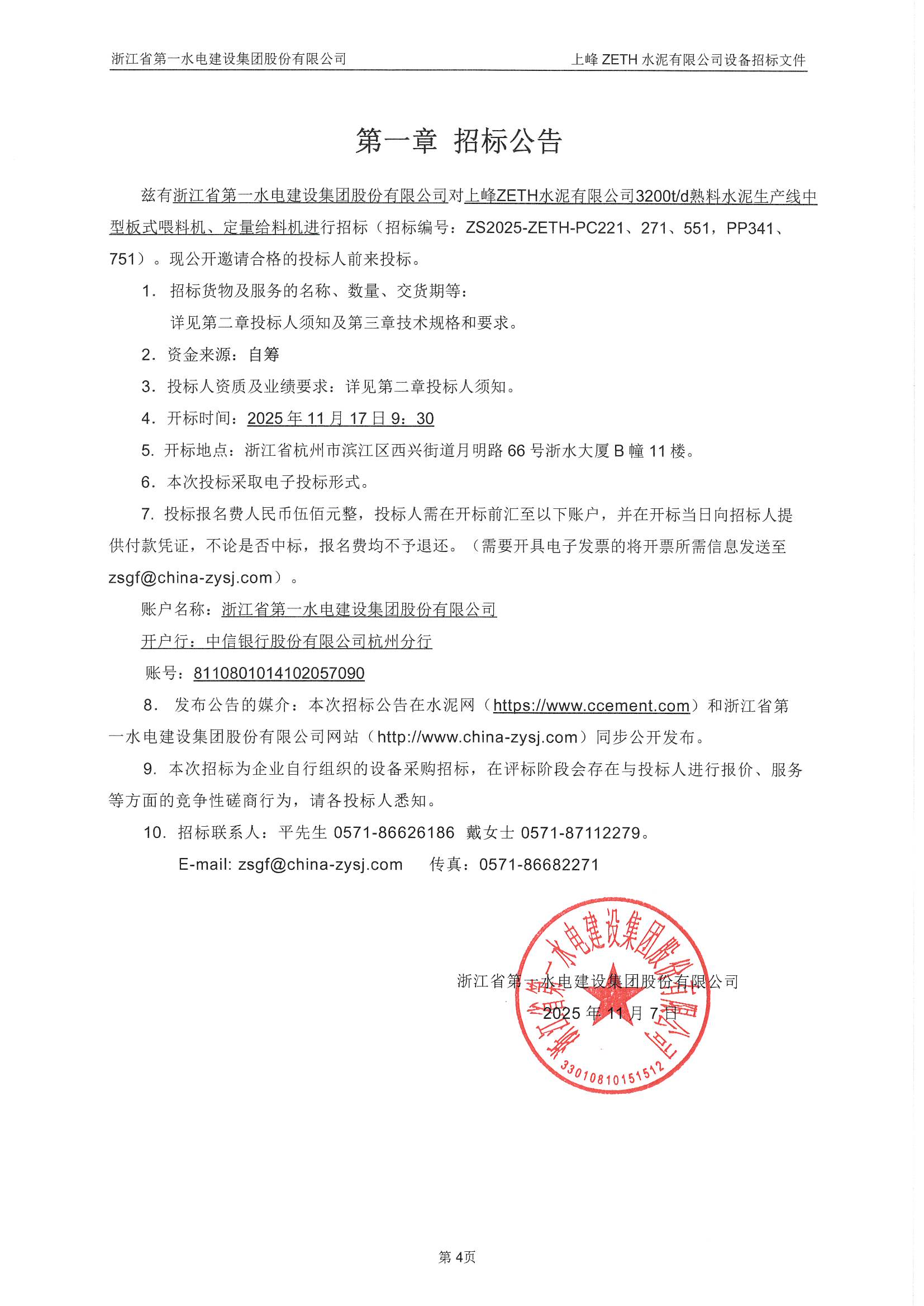 上峰ZETH水泥有限公司3200t/d熟料水泥生產(chǎn)線中型板式喂料機、定量給料機招標(biāo)公告